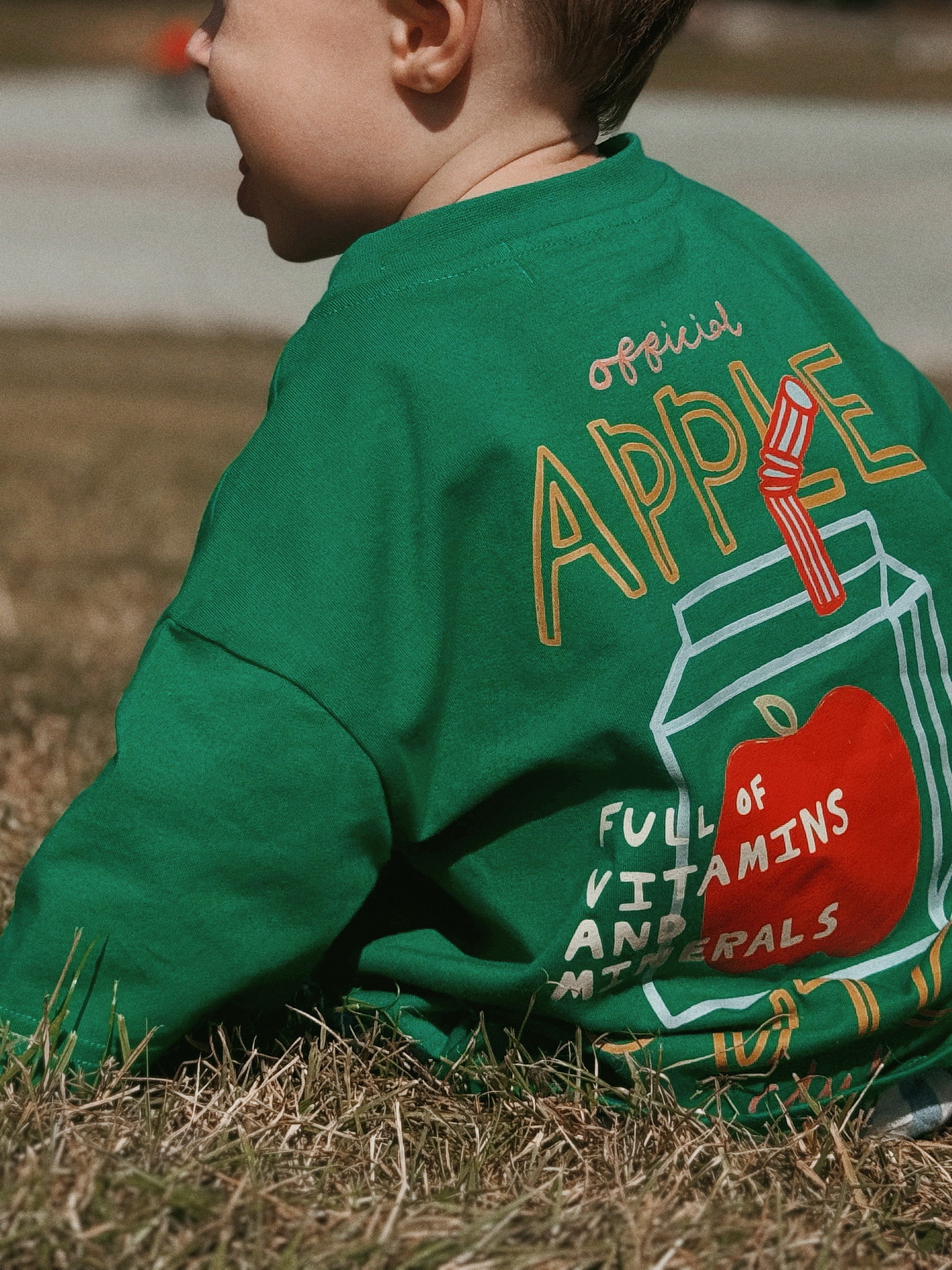 ["apple jucie","boys clothes","boys fashion","children","children's wear","colourful","colourful graphic","cool kids","cute kids clothes","Eclectic kids","gift ideas","girl's clothes","girls fashion","graphic tee","green","green tshirt","hand drawn","kids","kids clothes","kids club","kids fashion","kids tops","kids wear","no-wholesale","oversized","summer","t-shirt","toddler fashion","toddler tee","toddler tshirt","top","youth"]